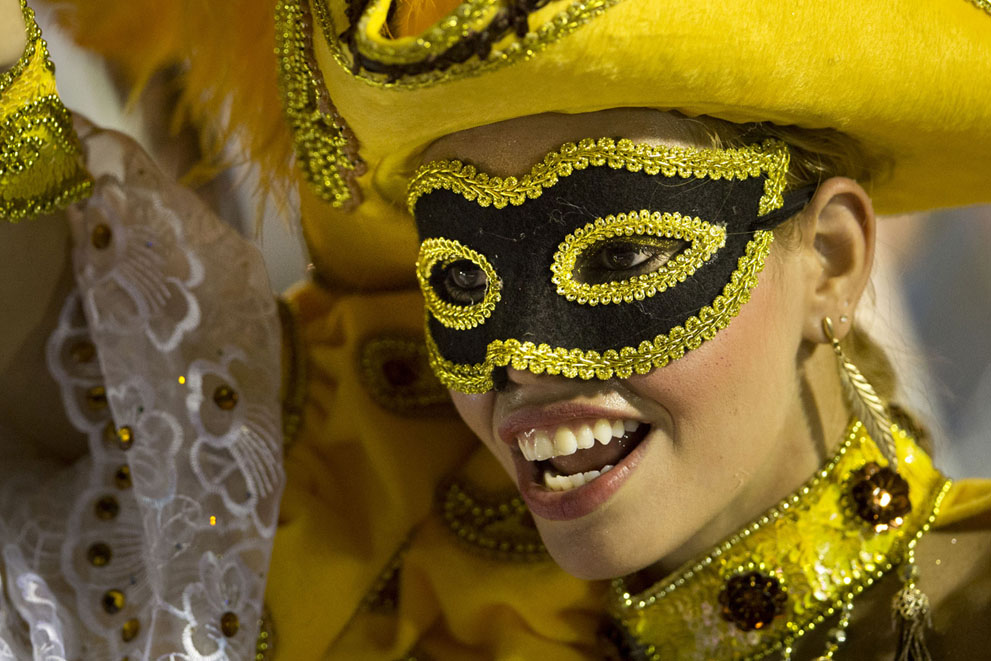 A reveler from the Mocidade Alegre Samba School takes part in a carnival at Anhembi Sambadrome, in Sao Paulo, Brazil, on February 10, 2013.